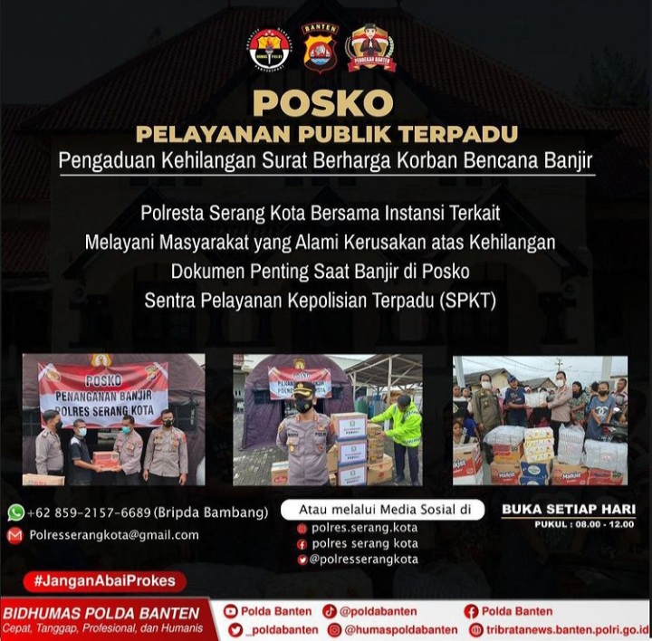 BANTENNLINE.COM, SERANG – Pelayanan Posko Laporan Kehilangan dan Kerusakan dokumen korban banjir tidak memungut biaya, gratis. Kecuali untuk kehilangan dan kerusakan surat tanah.