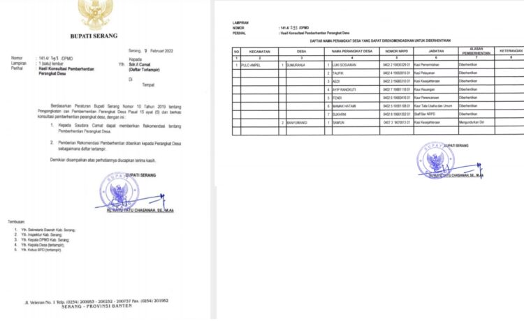 Pemberhentian delapan perangkat desa tersebut tertuang dalam surat rekomendasi Bupati Serang, Ratu Tatu Chasanah Nomor 141.4/ 293/ DPMD yang ditujukan langsung kepada Camat Kecamatan Pulo Ampel tentang pemberhentian perangkat desa.