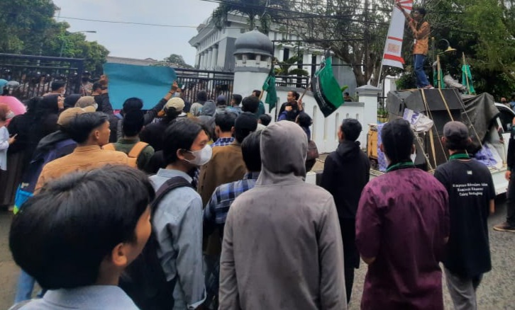 Di kantor Bupati, para mahasiswa melakukan orasi sambil membentangkan spanduk kecaman bertuliskan “Negara Gawat Indonesia Darurat.”
