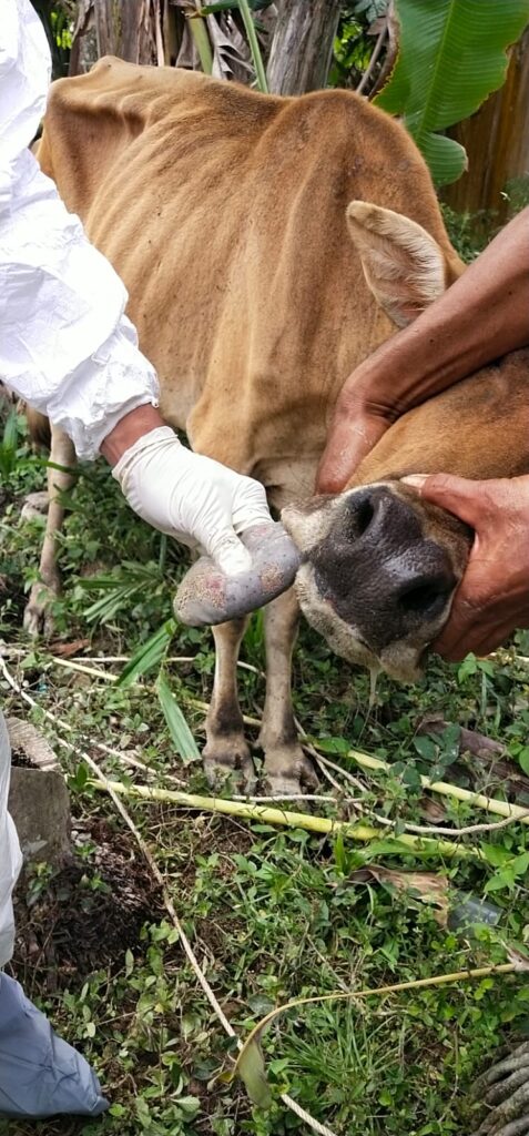 Laporan kasus penyakit menular sapi dengan tanda klinis awal penurunan nafsu makan, hipersalivasi, panting, kepincangan bahkan beberapa sampai berbaring dan demam.