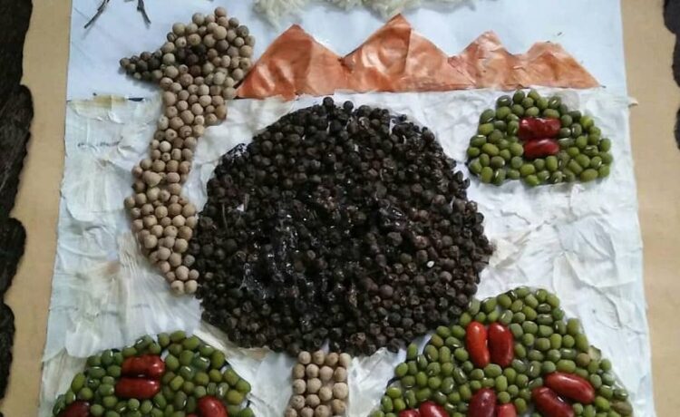 Contoh bahannya seperti barang bekas yang sudah dibersihkan, contohnya ; tutup botol, inner roll tisu toilet, batu-batuan, sendok plastik, biji-bijian,kancing baju dan lain-lain.