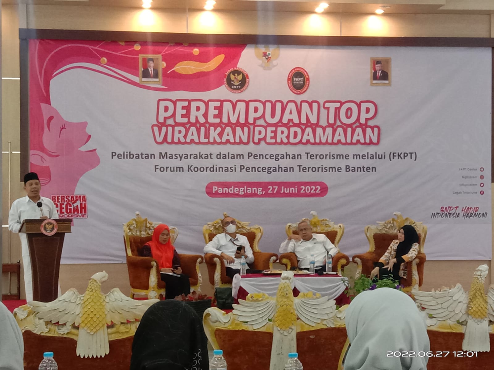 Kegiatan tersebut mengusung tema ‘Perempuan Top Viralkan Perdamaian,’ dengan menghadirkan para narasumber dari Kasubdit Pengamanan Lingkungan BNPT RI Setyo Pranowo, Pengamat Sosial dan Pengajar Vokasi UI Devie Rahmawati dan Badan Intelejen Negara Provinsi Banten (BIN Banten) Zulkarnain.