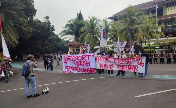 BANTENLINE.COM, TANGERANG – Himpunan Mahasiswa Tangerang (Himata) menggelar aksi damai di hari jadi Kabupaten Tangerang ke 390, di depan kantor Bupati Tangerang, pada Kamis (13/10/2022).