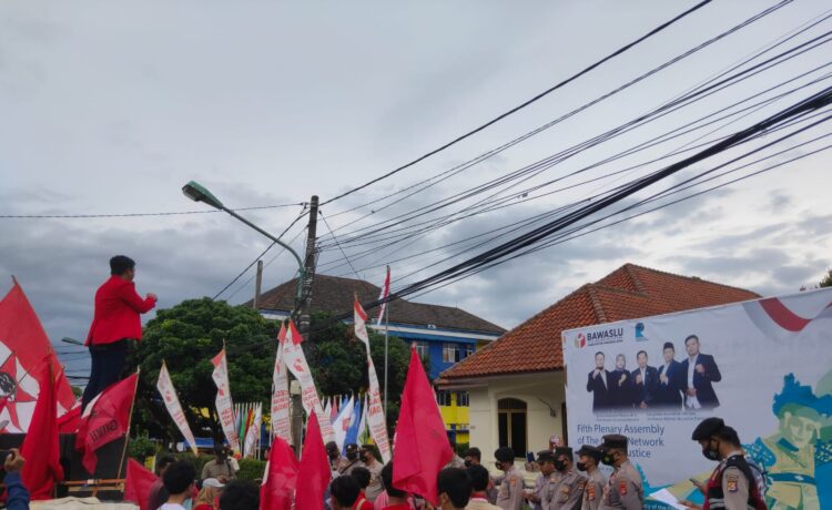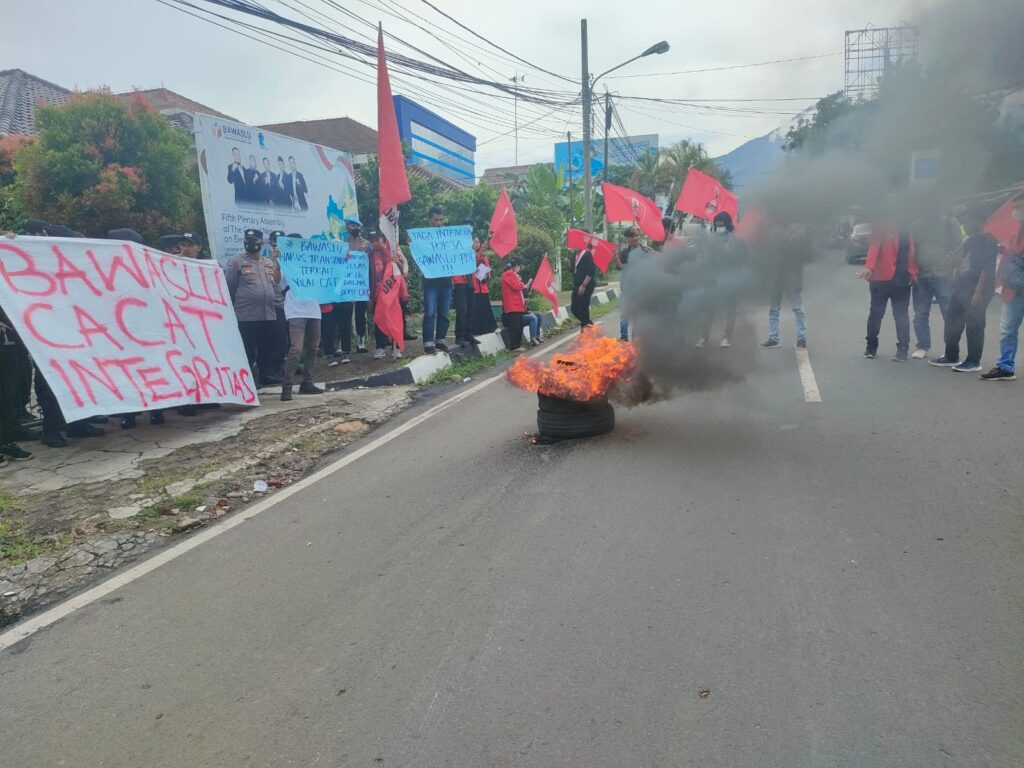Sejumlah Mahasiswa yang tergabung dalam DPC GMNI Kabupaten Pandeglang melakukan Aksi demoinstrasi di depan Gedung Bawaslu Kabupaten Pandeglang.