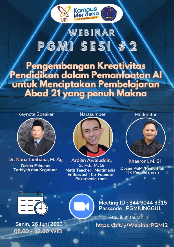 BANTENLINE.COM, SERANG KOTA – Jurusan Pendidikan Guru Madrasah Ibtidaiyah (PGMI) Fakultas Tarbiyah dan Keguruan (FTK) UIN SMH Banten menggelar Webinar bertajuk “Pengembangan Kreativitas Pendidikan Dalam Pemanfaatan Al Abad 21 yang Penuh Makna,” pada Senin (26/06/2023).