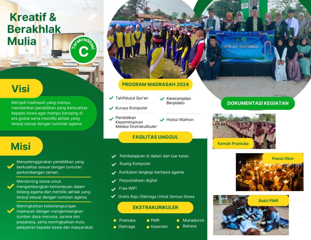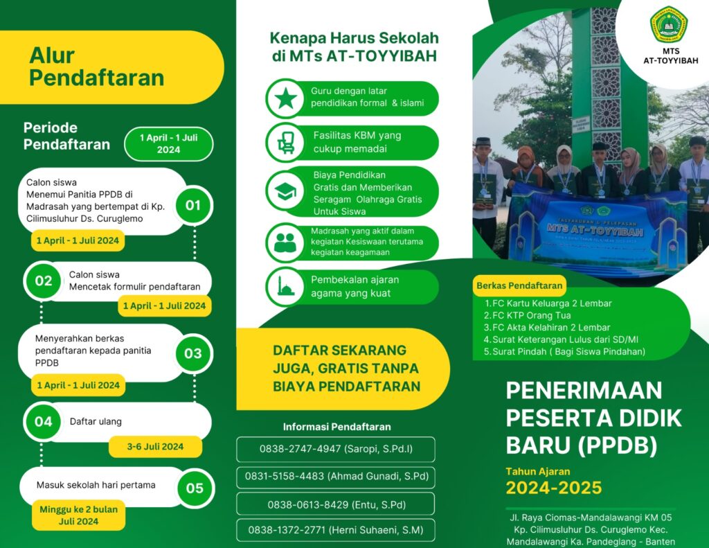 Agenda Tersebut bernama IKHTIFALAN AKBAR dengan tema “Tranasformasi Pendidikan, Masa Depan Yang Cerah Menyongsong Era Inovasi dan Perubahan” ini digelar di Gedung MTs At Toyyibah Curuglemo dengan nuansa islami dan seni dimana pada pagi harinya dilaksanakan kegiatan yang sakral bagi madrasah dibawah naungan Kemenag Kabupaten Pandeglang ini yakni Pelepasan dan kenaikan kelas siswa-siswi Taman Pendidikan Alqur’an (TPQ), Madrasah Diniyah Takmiliyah Awaliyah (MDTA) dan Madrasah Tsanawiyyah (Mts).