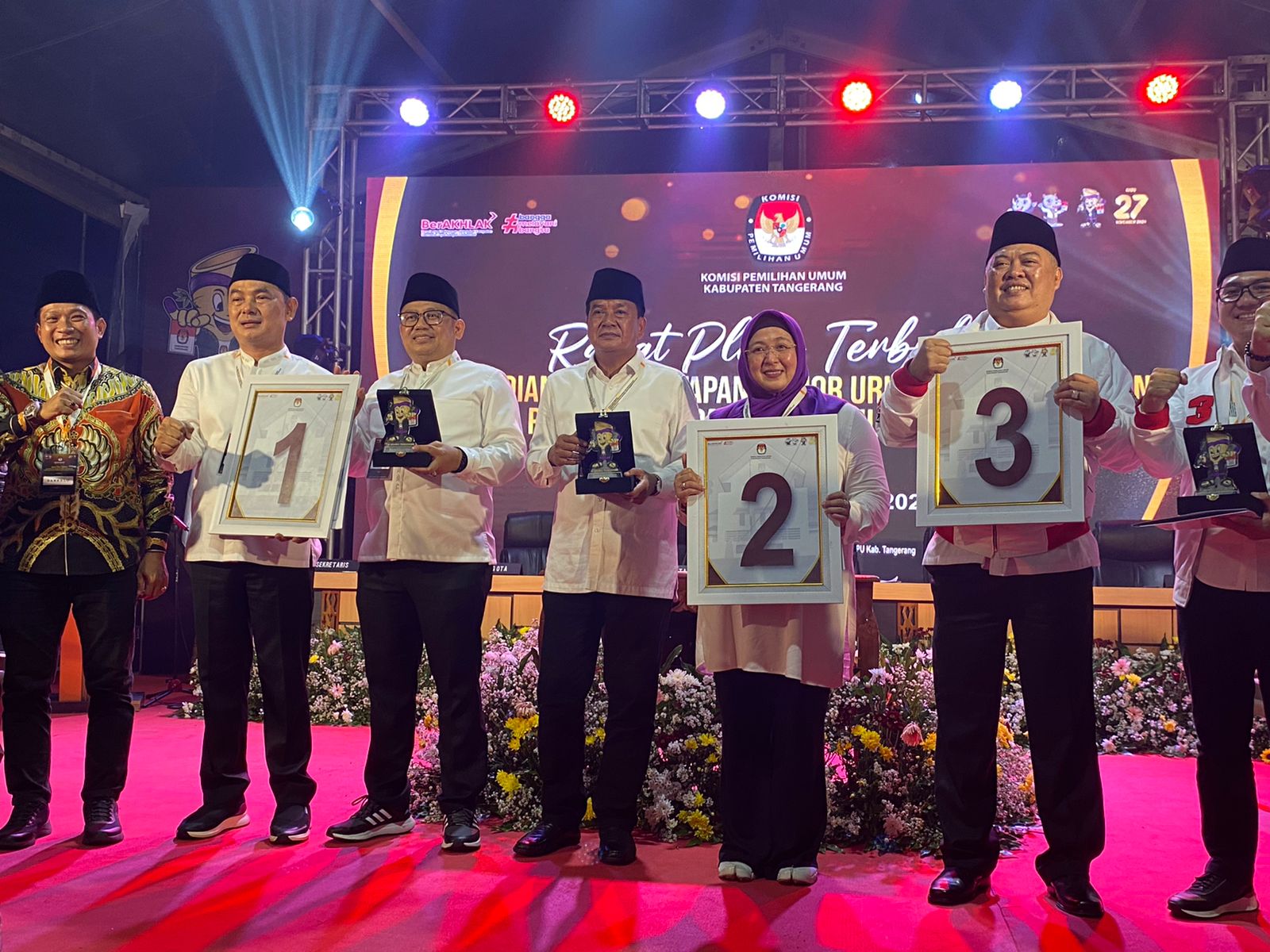 KABUPATEN TANGERANG, BANTENLINE – Pasangan Calon Bupati-Wakil Bupati Tangerang Maesyal Rasyid-Intan Nurul Hikmah mendapat nomor urut 2, pada pleno terbuka di pengundian dan penetapan nomor urut, di halaman Kantor KPU Kabupaten Tangerang, Senin (23/9/2024).