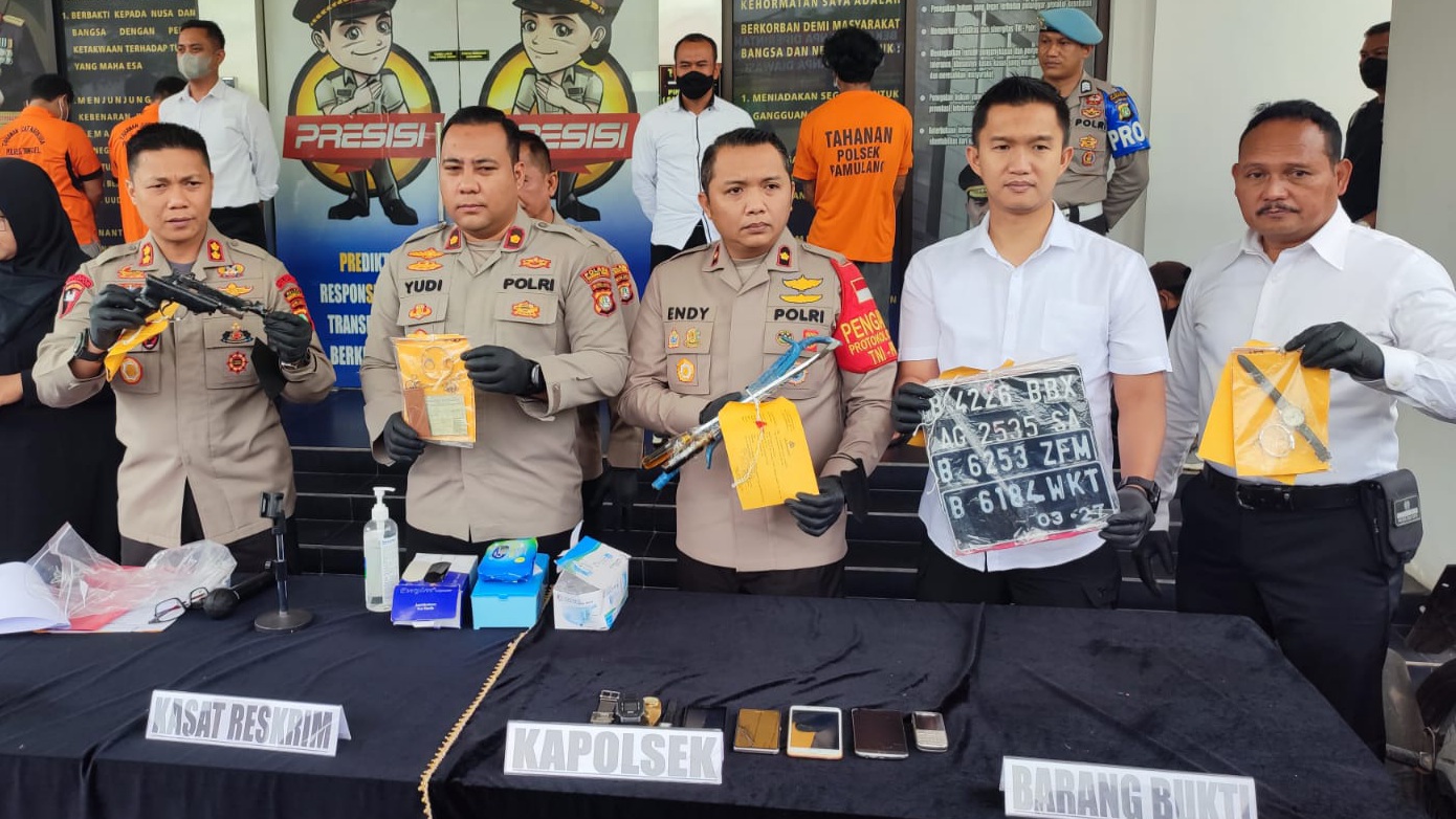 Polisi memperlihatkan sejumlah barang bukti yang terdiri dari senjata api rakitan, dua buah linggis, dan beberapa jam berbagai merek
